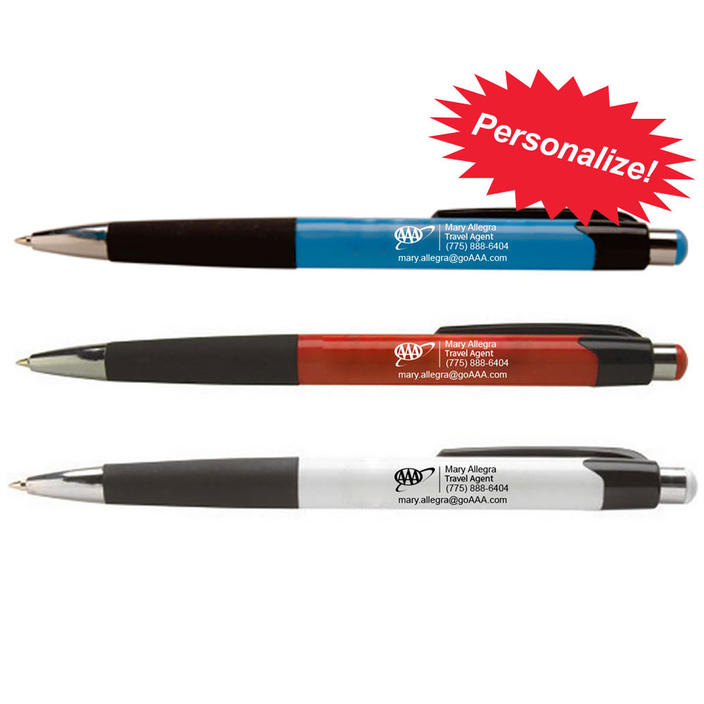 The solid and strong push-action retractable pen, features distinctive silver accents and stylish barrel colors. Constructed of plastic, this ultra-smooth writing pen contains blue ink.